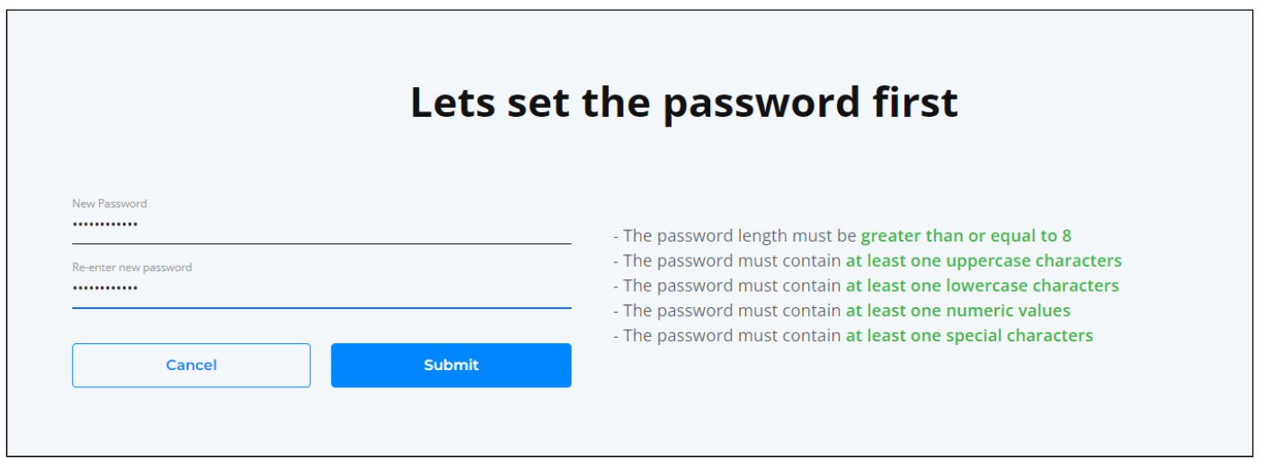 1. Setup your account password as per the instructions and click on Submit. Please follow the below guidelines for setting up your password: