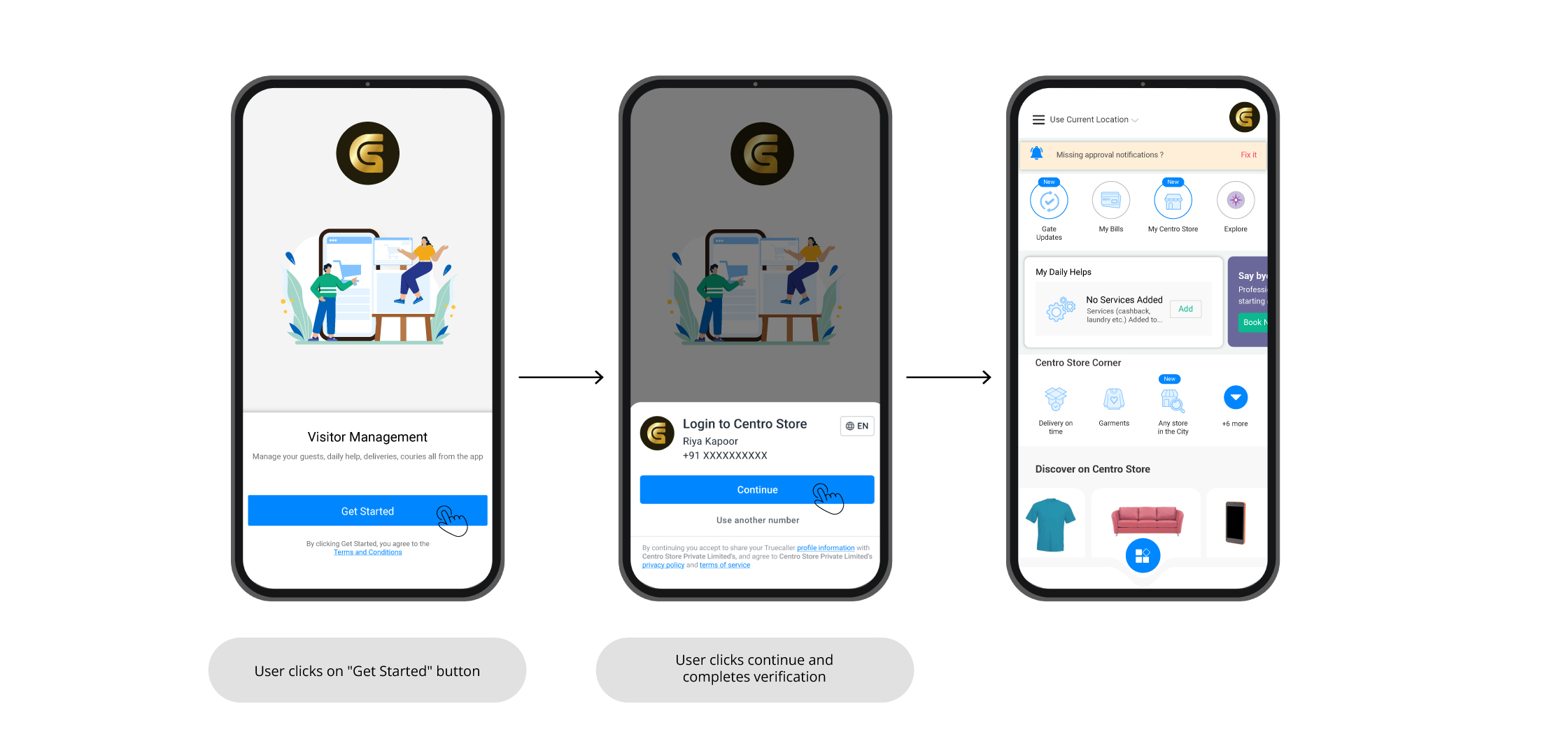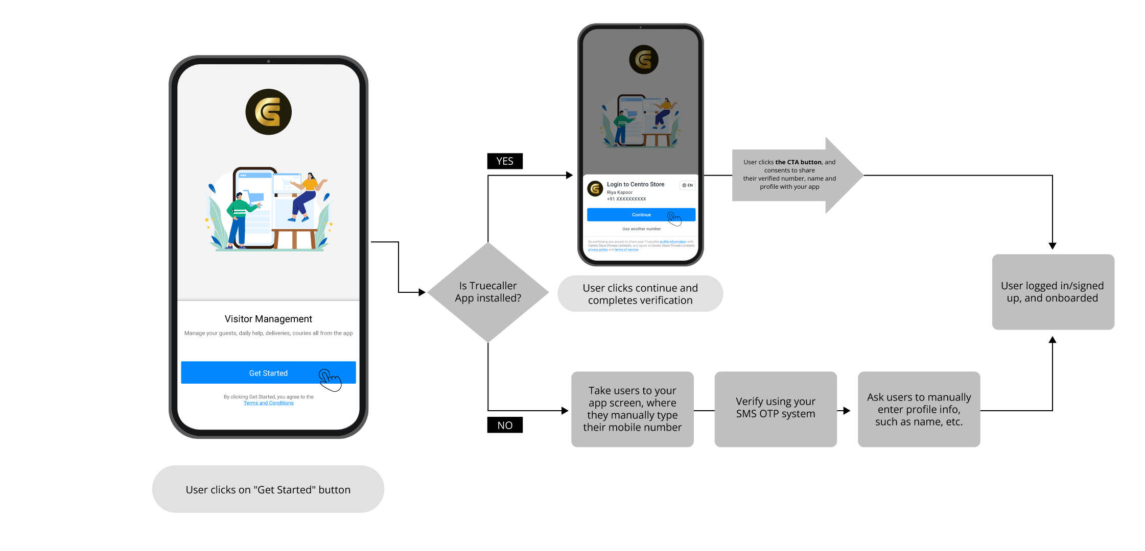 When mobile apps onboard their users, there are multiple ways in which they address the onboarding process. For example, one could address it as Get Started, Join Us, Login, Sign up, etc., shown as a button to the users, clicking which leads to the mobile number-based identity verification of users. Here is such an example from CetroStore.