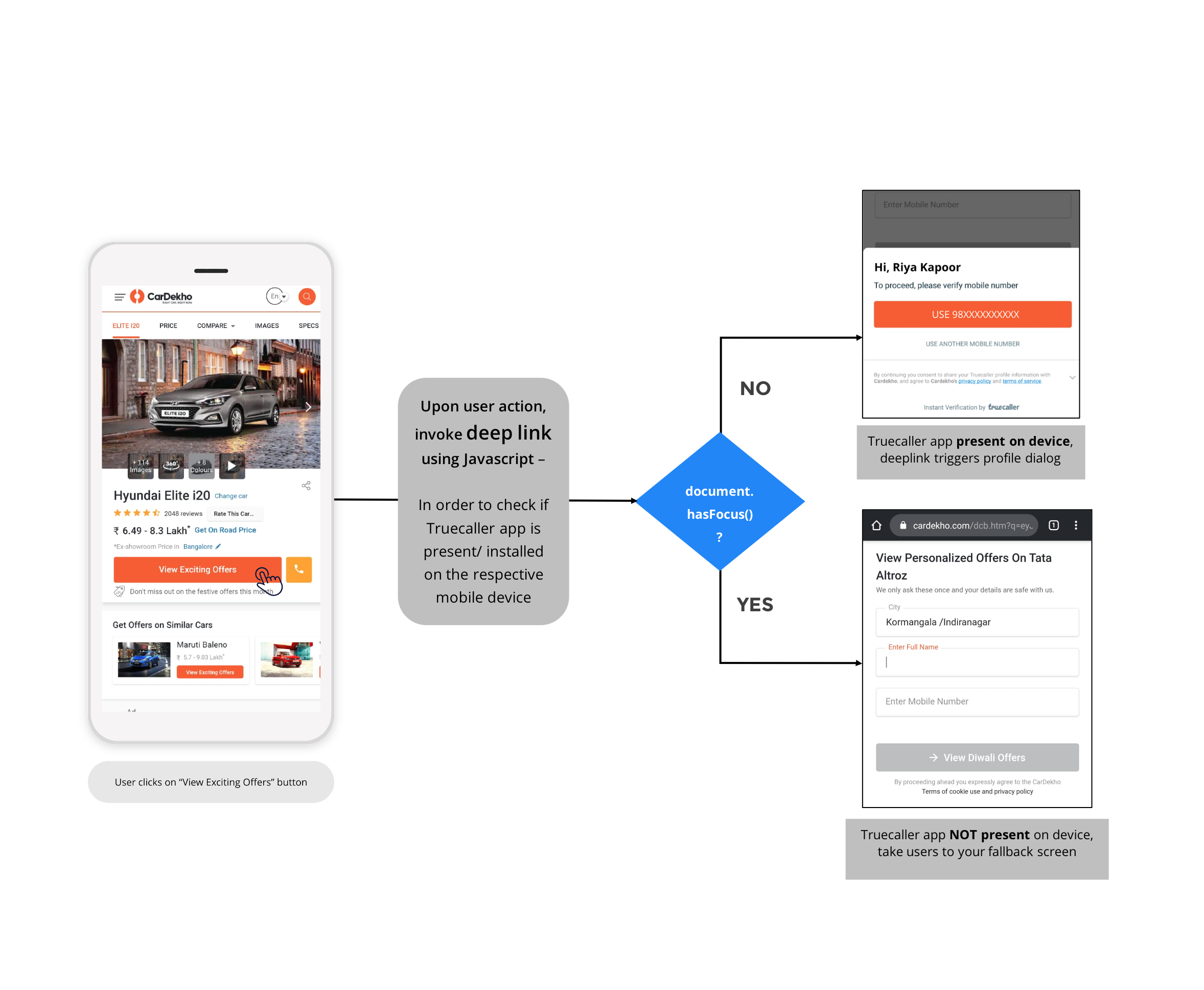 This would trigger the deep link, and open the user's Truecaller profile dialog if the app is present on the device. And in case the app is not present, nothing opens. So now, using javascript, you can check for the document focus: a. If the truecaller dialog opened, the document would have lost focus and you'll be taken to the else condition in the above check. b. While in case the Truecaller app is not present on the device, the focus would always remain with the document and hence, you'll have the control in the 'if' condition. Accordingly, you can map the next action on your page based on the two conditions.